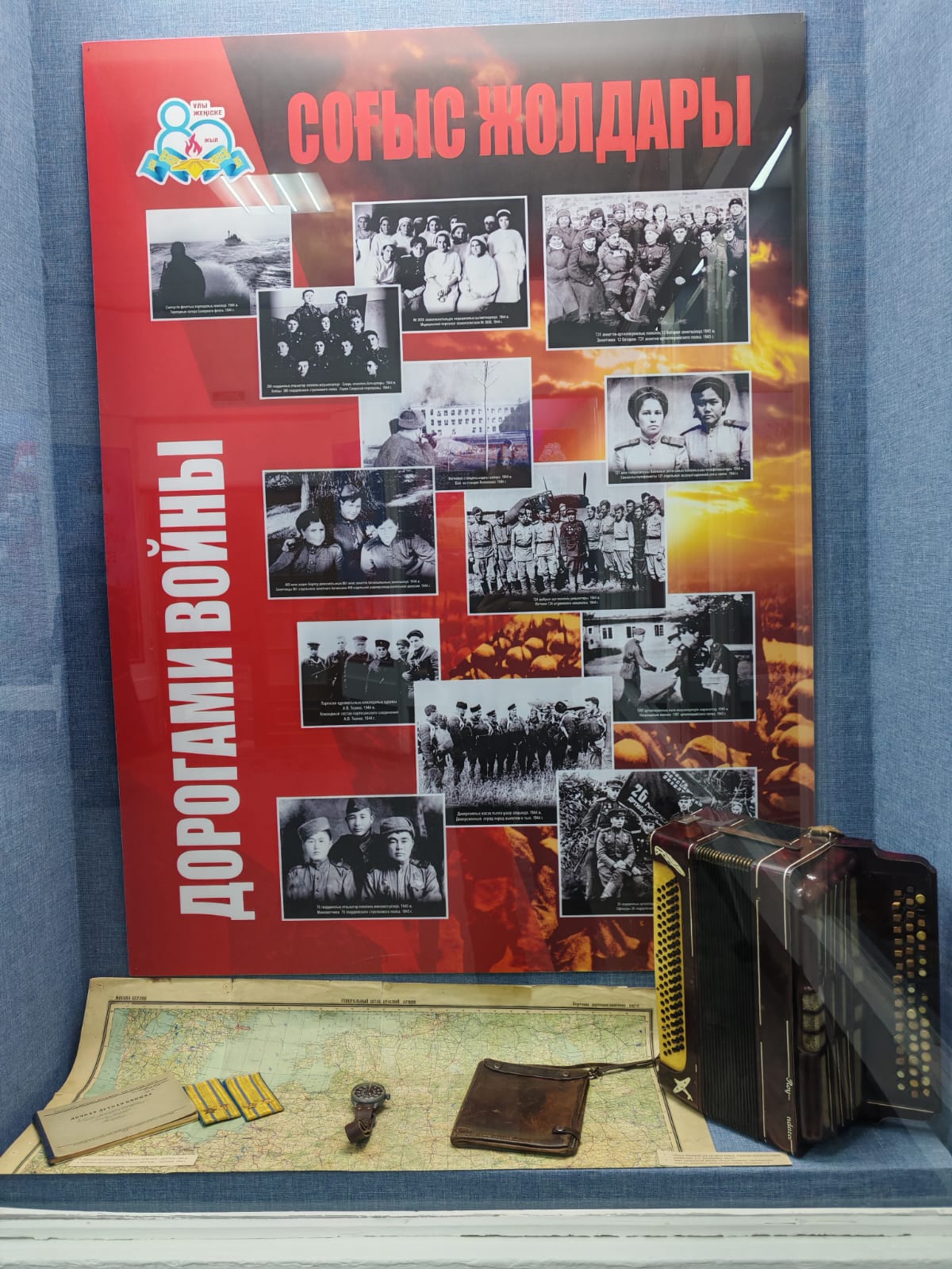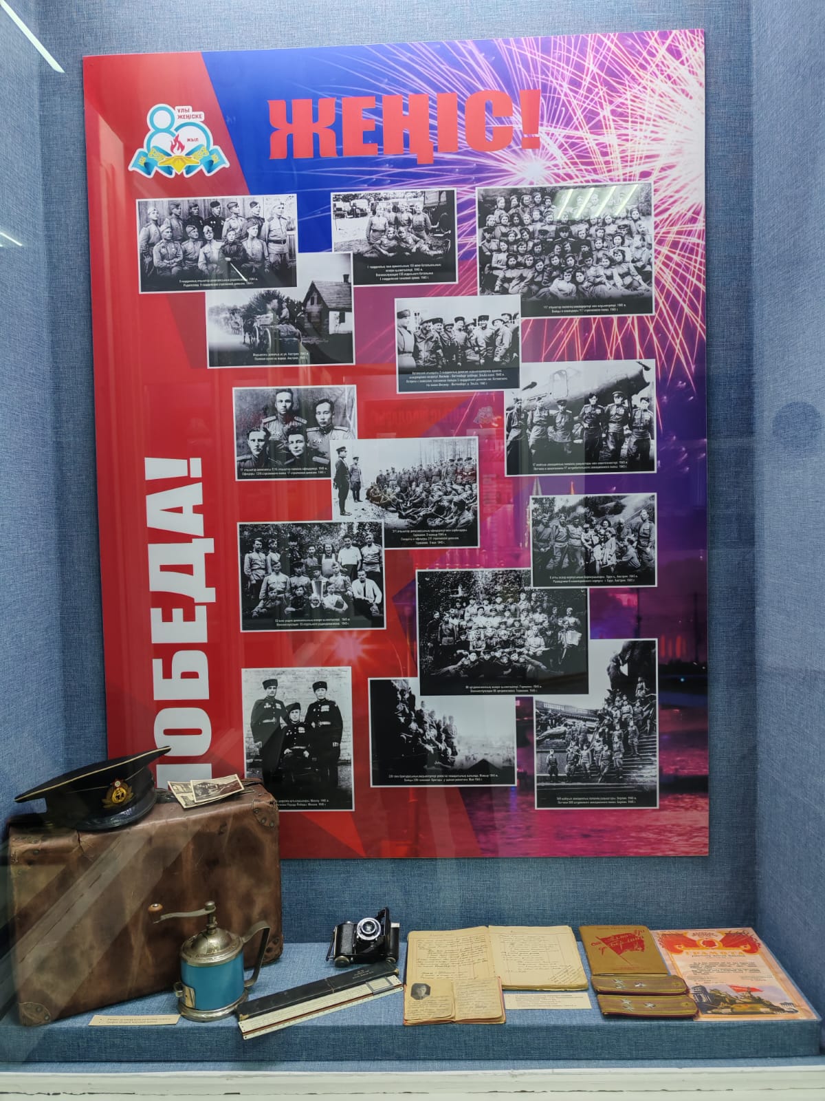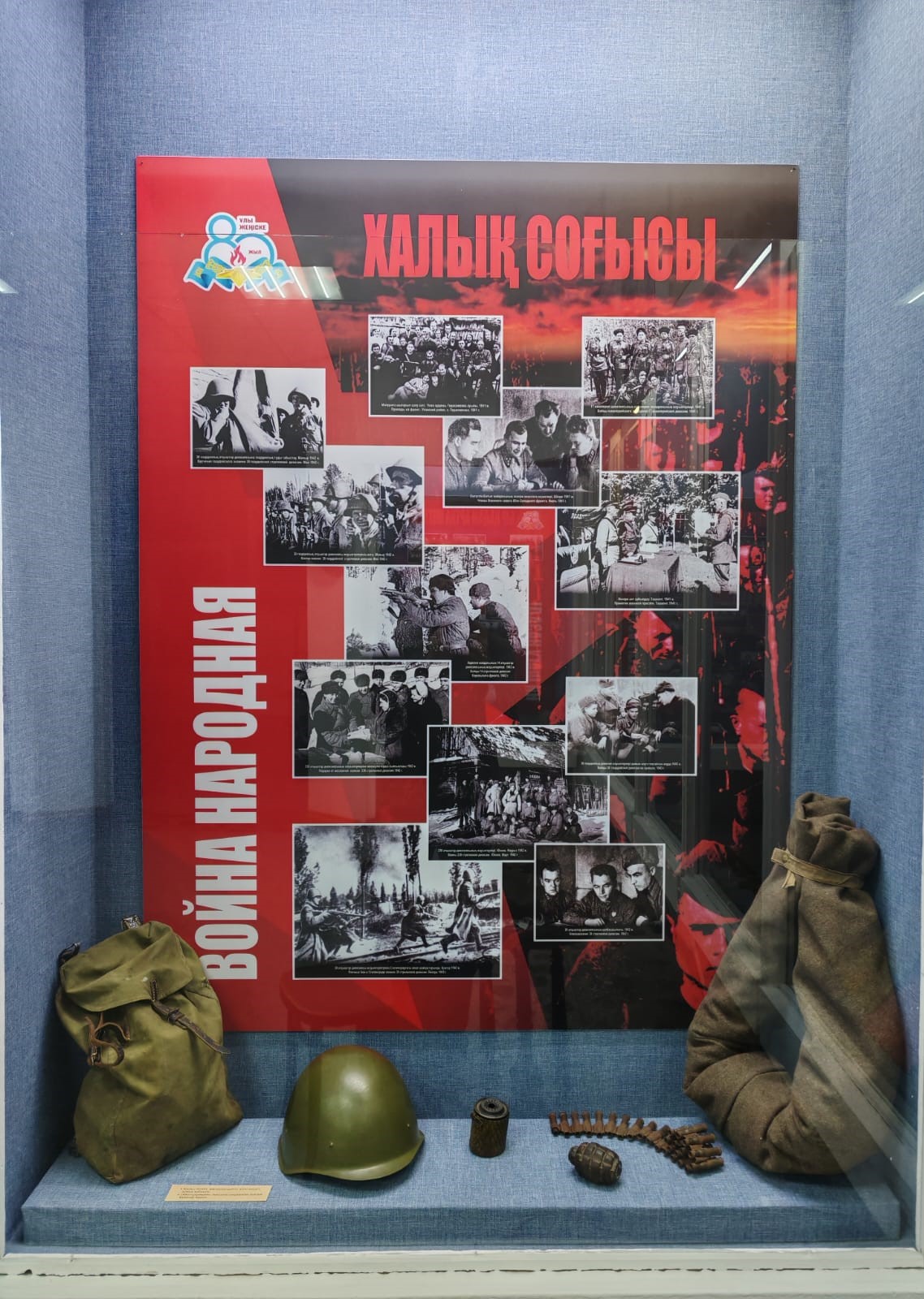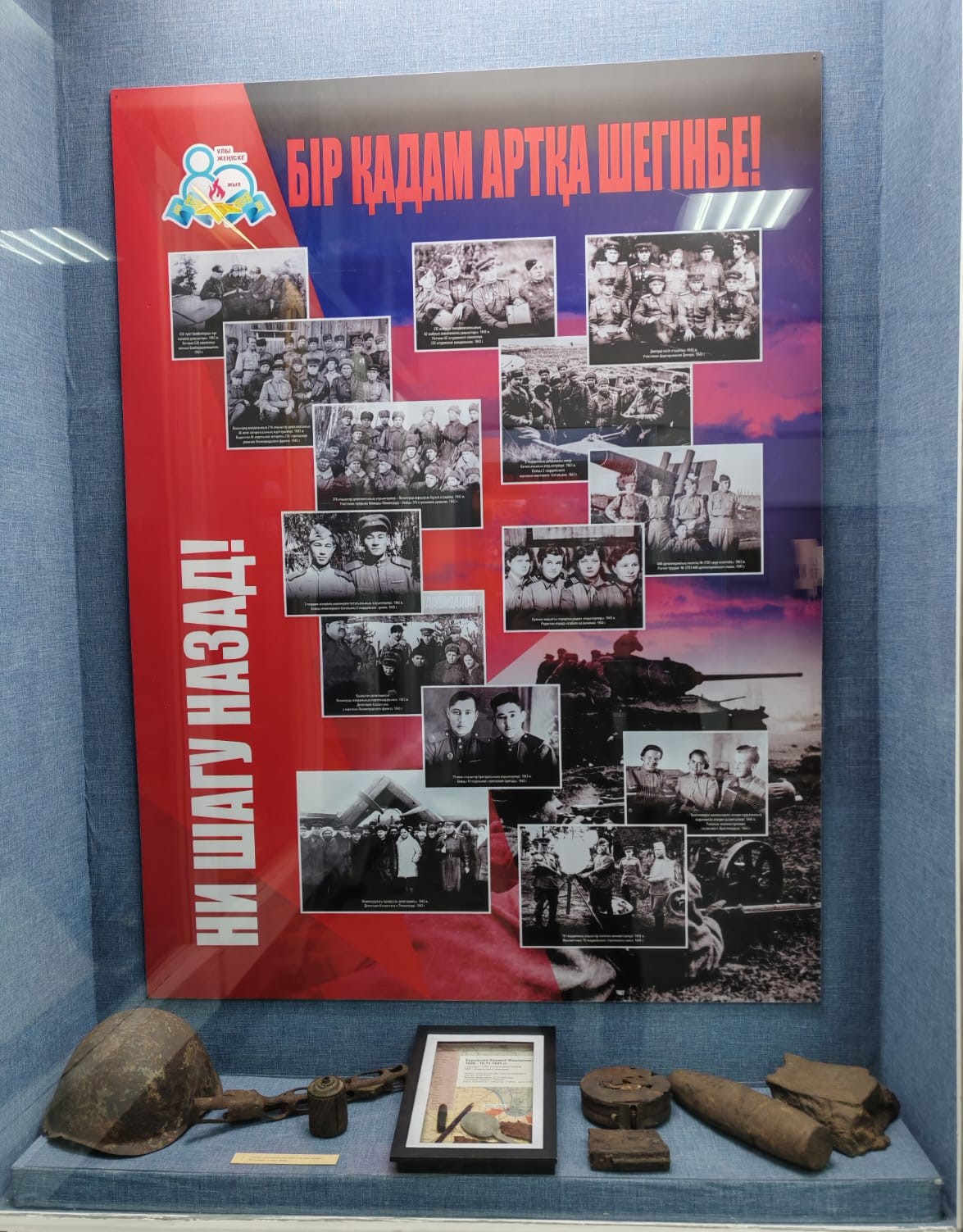 Экспозицияның екінші бөлімінде музей топтамасының заттары: марапаттар мен белгілер, майданнан келген хаттар, плакаттар мен парақшалар, майдан газеттері қойылған. Көрмеде киім-кешек, құрал-жабдықтар, әскери киімнің атрибуттары, сарбаздар мен офицерлердің тұрмыстық заттары көрсетілген.