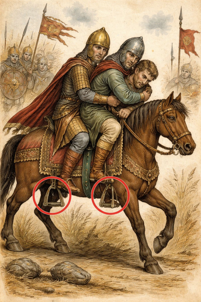 Ал Византия әскерлерінде атқа мінуді жеңілдету мақсатында олардың ер-тоқымдарының сол жағына қосарлы үзеңгі бекіту қажет болды. Яғни әдеттегі алдыңғы үзеңгіден бөлек, артқы доғада да үзеңгі болу керек еді. Ол жараланған және аттан құлаған әскерлерді және оларға қарайтын депоттаттардың атқа мінуін жеңілдету мақсатында қолданылған. Осылай үзеңгінің адам өмірінде атқаратын рөлі біртіндеп арта түсті.