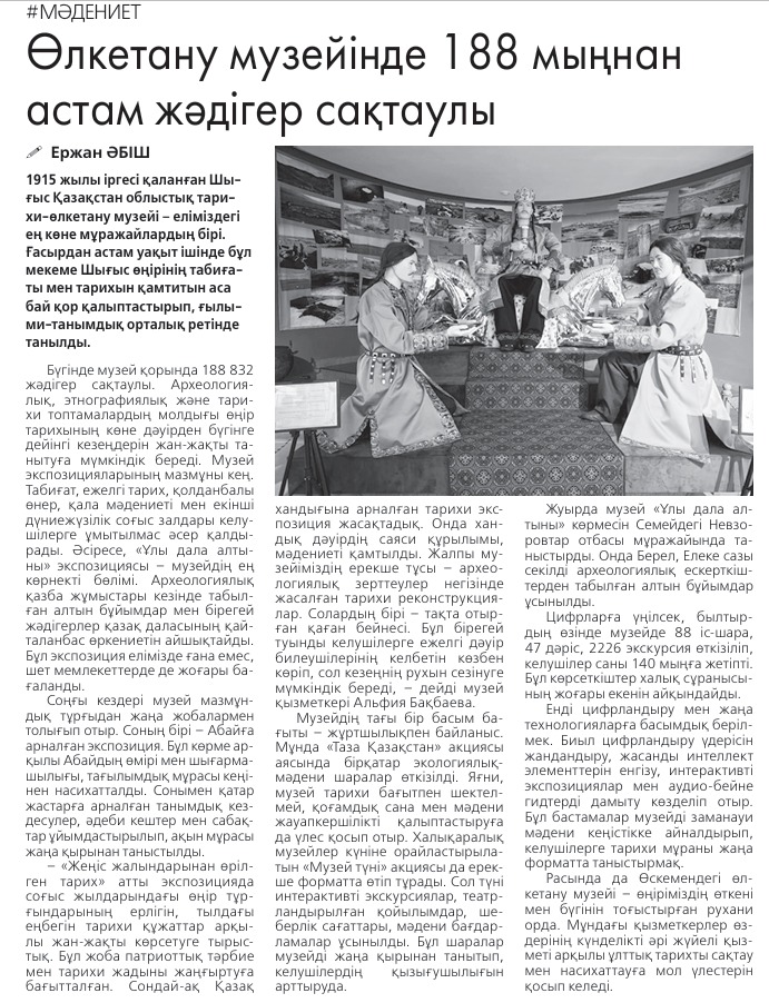 Басты бет » «Өлкетану музейінде 188 мыңнан астам жәдігер сақтаулы»«Өлкетану музейінде 188 мыңнан астам жәдігер сақтаулы» Post Views: 7 Бөлісу/Поделиться: