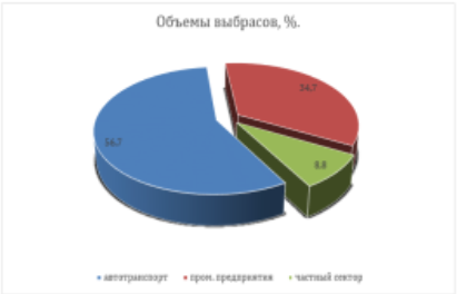Исходя из данных диаграммы, большая часть загрязнения приходится на автотранспорт. Это связано с увеличением численности населения и повышения уровня жизни. Второе место занимают промышленные предприятия. Так как, Усть-Каменогорск – это центр цветной металлургии, помимо заводов по переработки металлов имеются и сопутствующие предприятия для обслуживания. В свою очередь все промышленные предприятия влияют на окружающую среду. На третьем месте находится частный сектор.