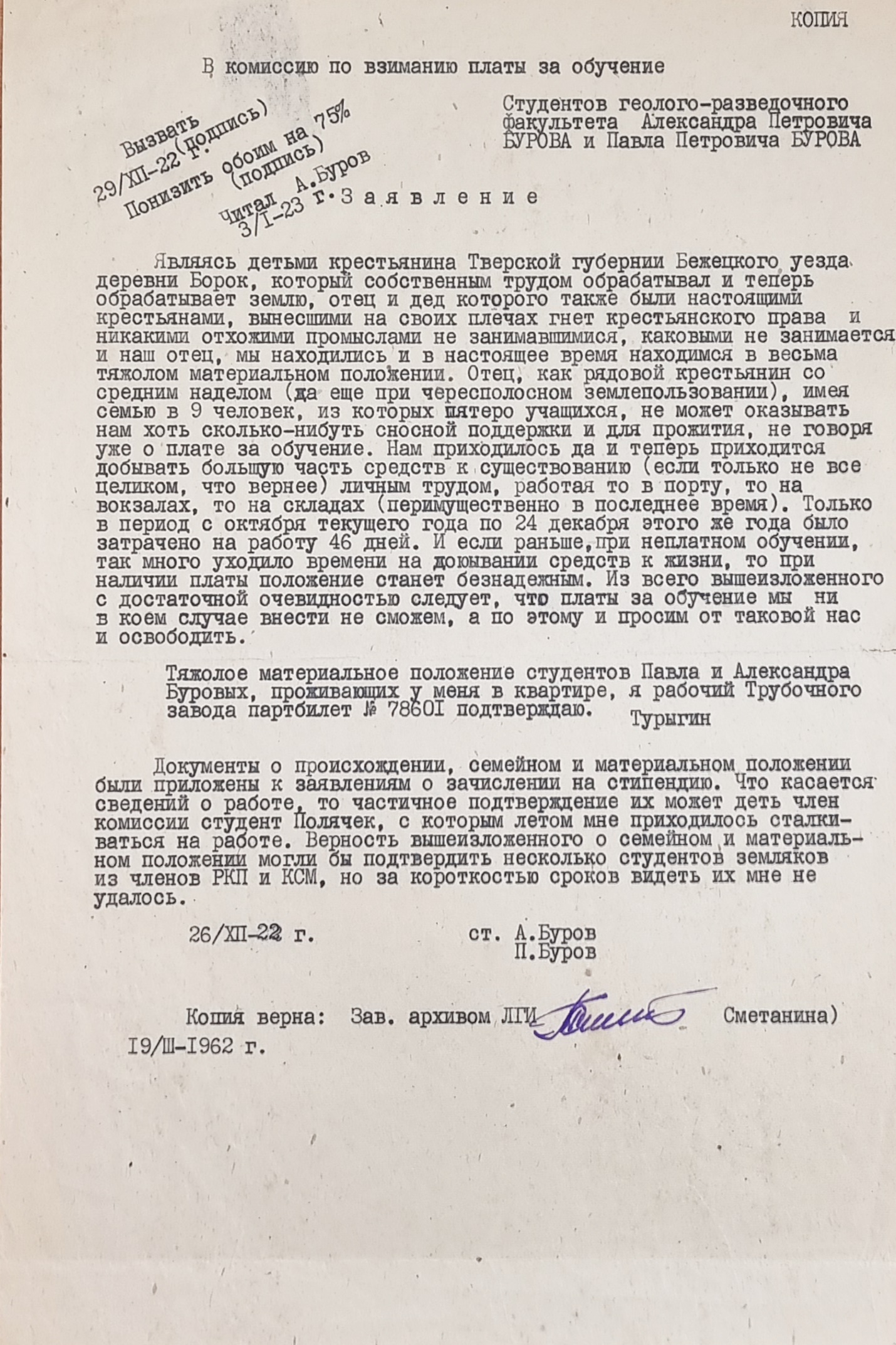 Итак, терпя лишения и невзгоды, братья учатся в Петроградском горном институте. Любовь и стремление к знаниям им привил отец – зажиточный крестьянин (после революции середняк). Пётр Иванович Буров отличался большим трудолюбием и широтой ума, был мастером на все руки. Не имея какого бы то ни специального образования, он сумел построитьсвоими руками маслобойню. Несмотря на большую семью в 9 человек, почти всем своим детям (четырем из пяти) отец дал высшее образование.