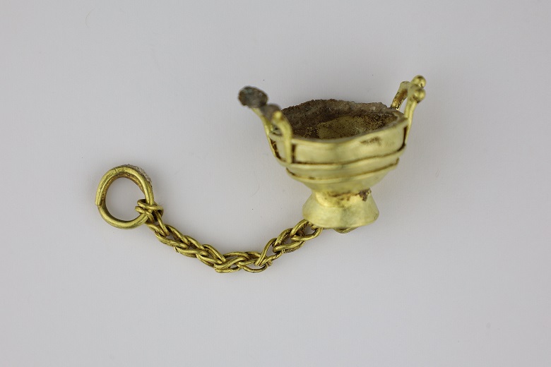 Особого внимания заслуживает изящная золотая подвеска в форме миниатюрного котла — вероятно, обрядовое украшение, обнаруженная в некрополе Елеке Сазы Тарбагатайского района в 2020 году. Датированное V-IV вв. до н.э.