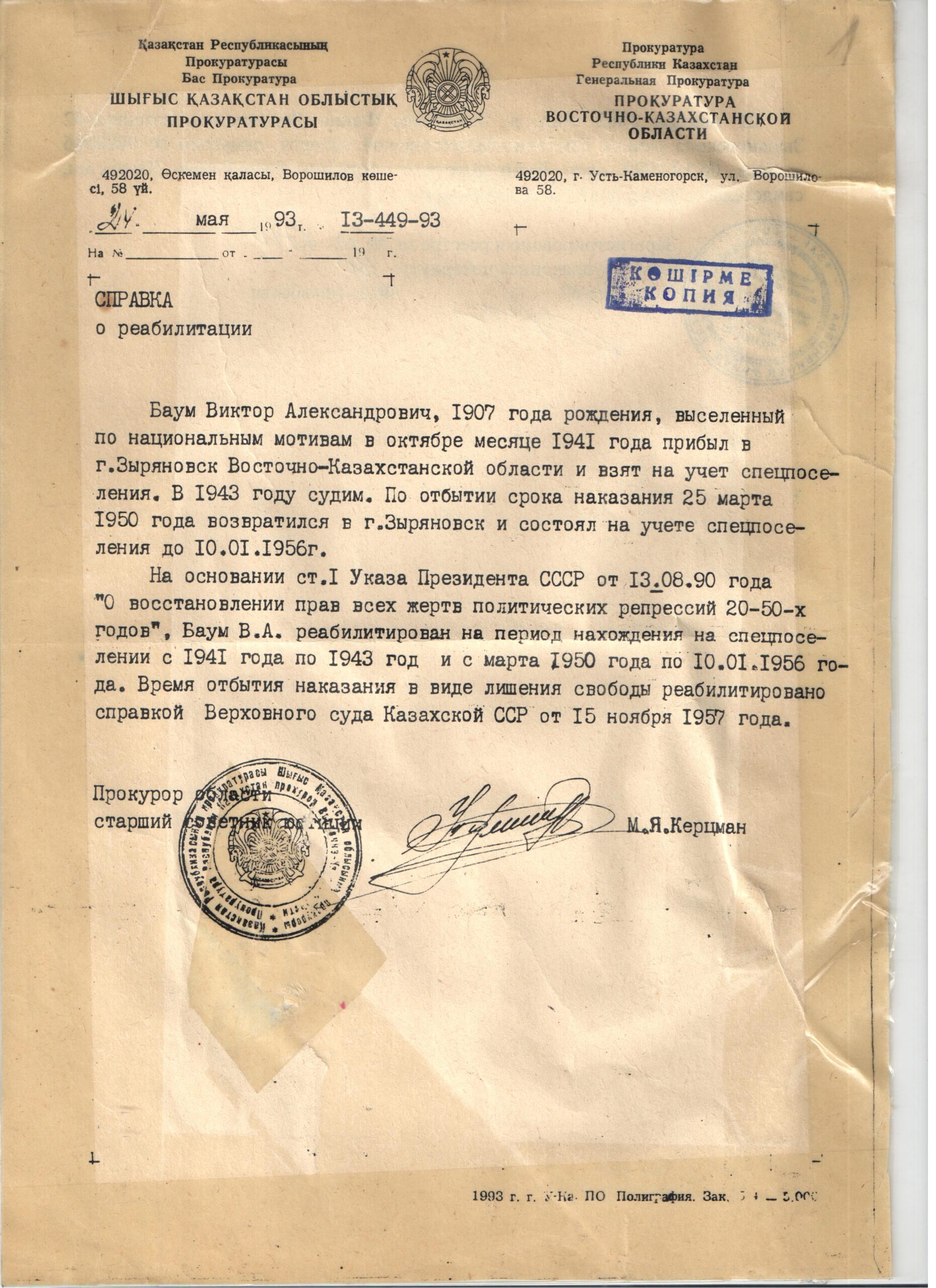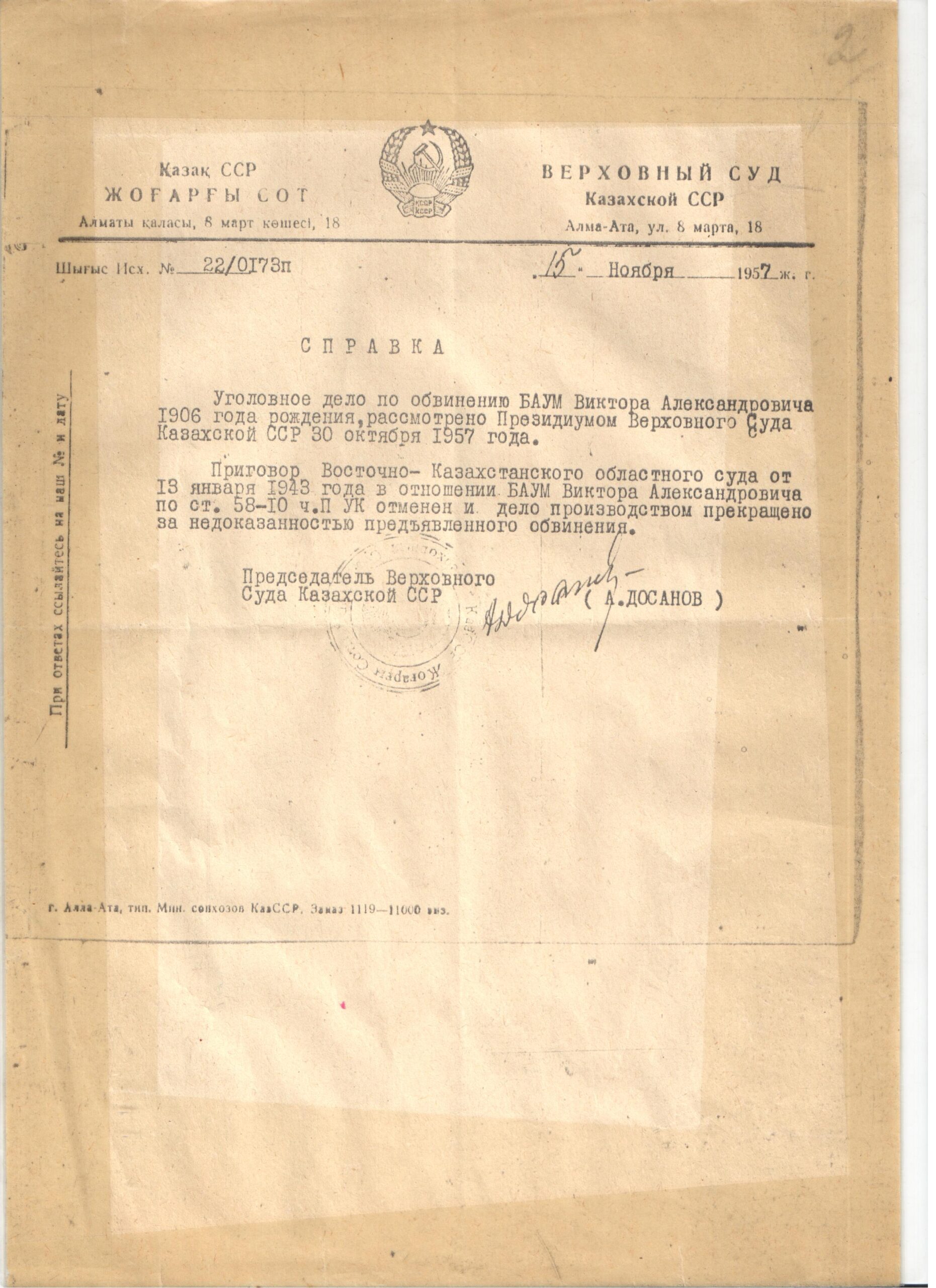 Отца в октябре 1942 года арестовали по 58 статье, как врага народа, за то, что он не донес о том, что вернувшийся с фронта нормировщик Кулагин стал рассказывать, в каких условиях ему пришлось воевать: не было ни связи, ни питания, ели мясо дохлых лошадей. И хотя все в голос утверждали, что при этих разговорах Баум не присутствовал, его все равно забрали в тюрьму. Всем дали по десять лет, а Виктору Александровичу — восемь. Сидел он в Карлаге, откуда его, изможденного от голода, отправили в Подмосковье проектировщиком на автомобильный завод. Восемь лет прошло в тюрьмах. Спасло его только то, что он был высококвалифицированным специалистом.